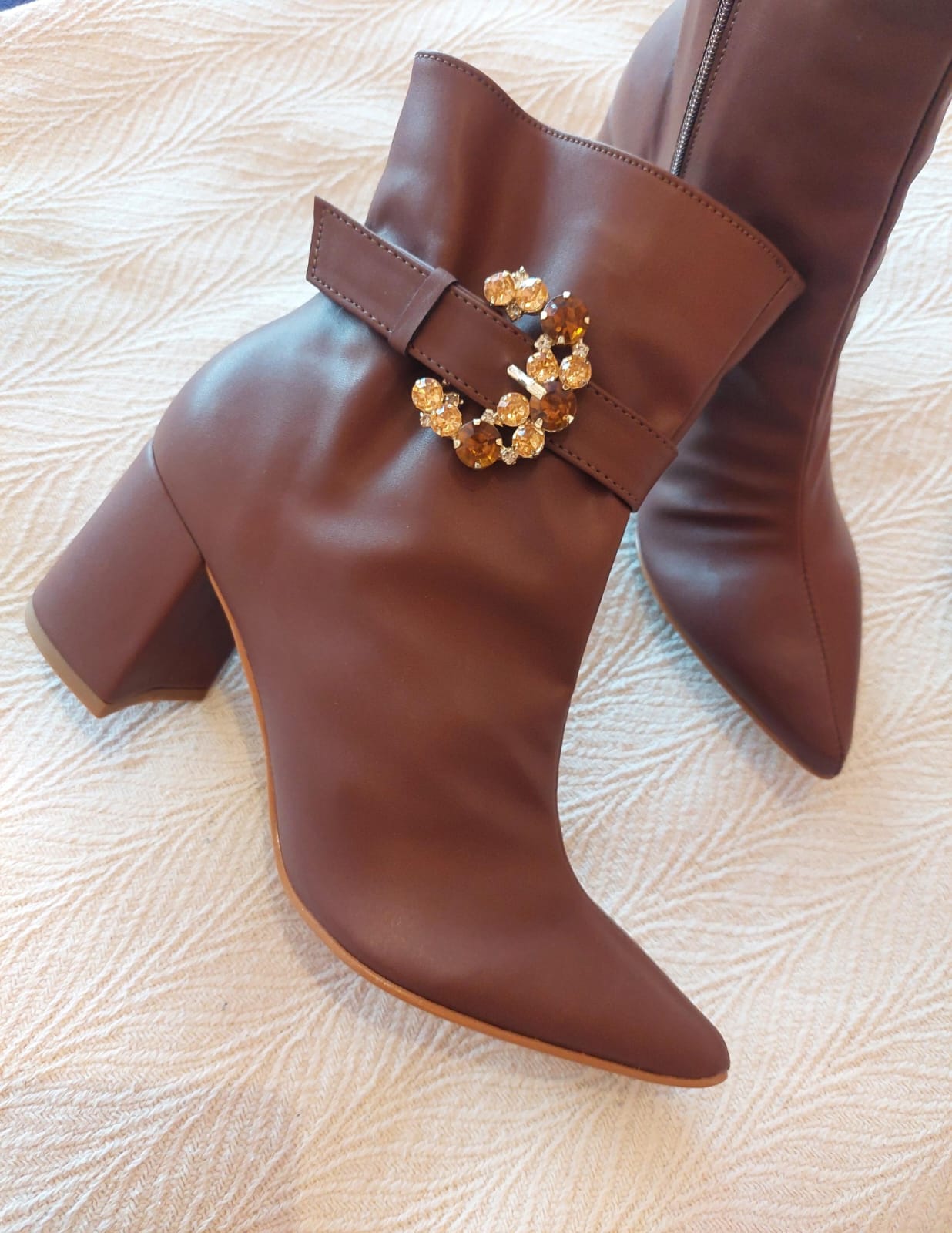Nossa campeã de vendas entre as botas, ela tem uma fivela toda es pedraria dando toque amais de elegância, mas é um detalhe que pode ser removido porque a fivela não e fixa então você tem uma bota 2 em 1, seu bico fino e elegante o salto de 5 cm confortável, forro em cacharrel super fofinho e confortável podendo até ser usada sem meia.