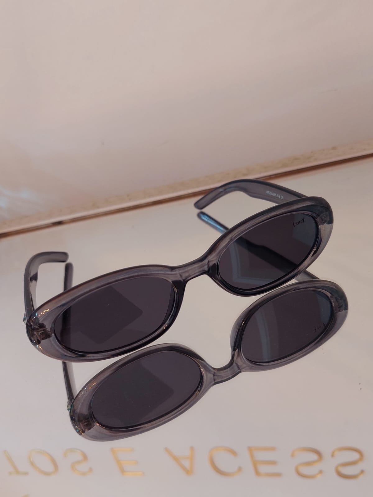 Oculos de sol com lentes escuras com proteção UV 400 e armação em acetato cinza transparente, a nova tendência de moda.