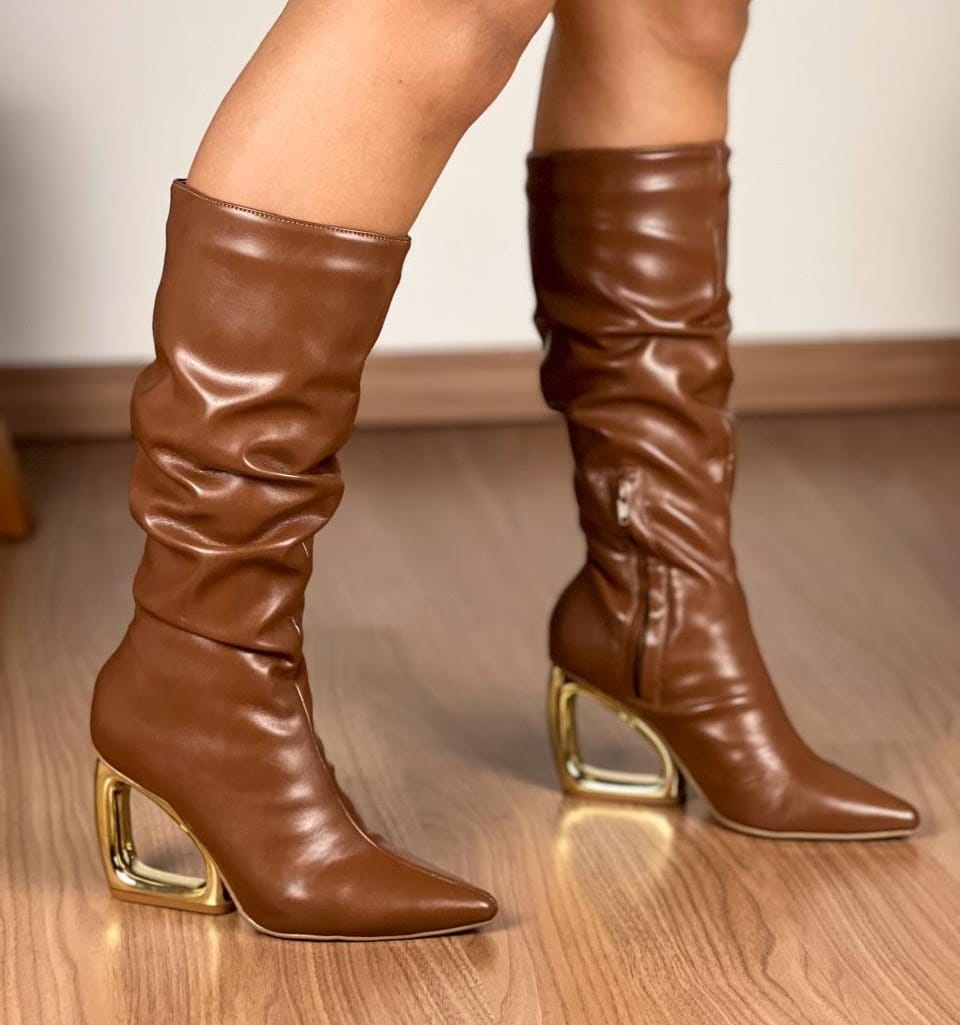 Um modelo que esta super em alta e com dois elementos poderosos que são os queridinhos do momento, Salto organico dourado de 9,5cm seu cano Slouch e o bico fino é a Bota perfeita para uma mulher elegante e fashionista.