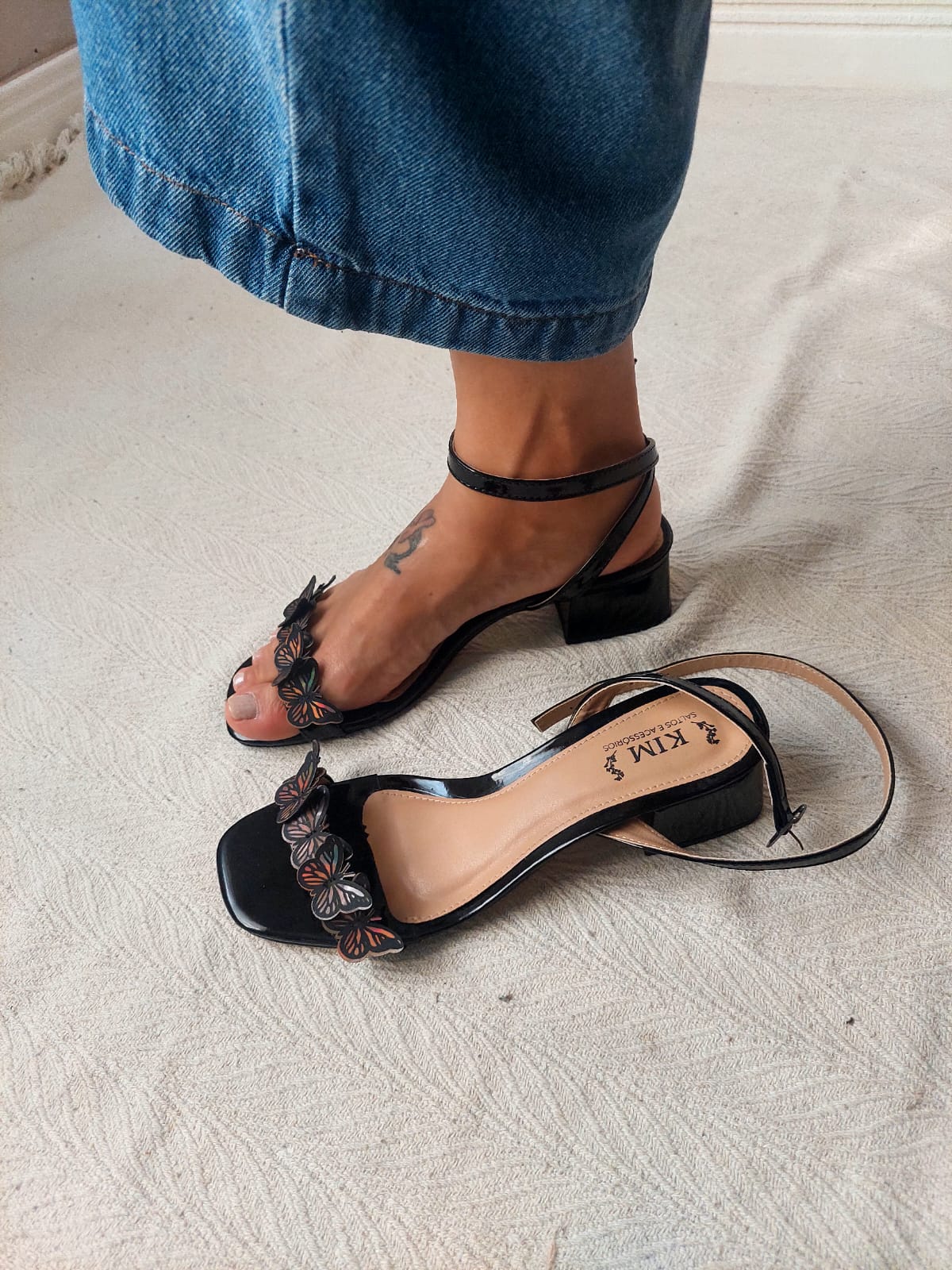 SANDALIA BORBOLETAS HOLOGRAFICAS PRETO VERNIZ SALTO 4CM