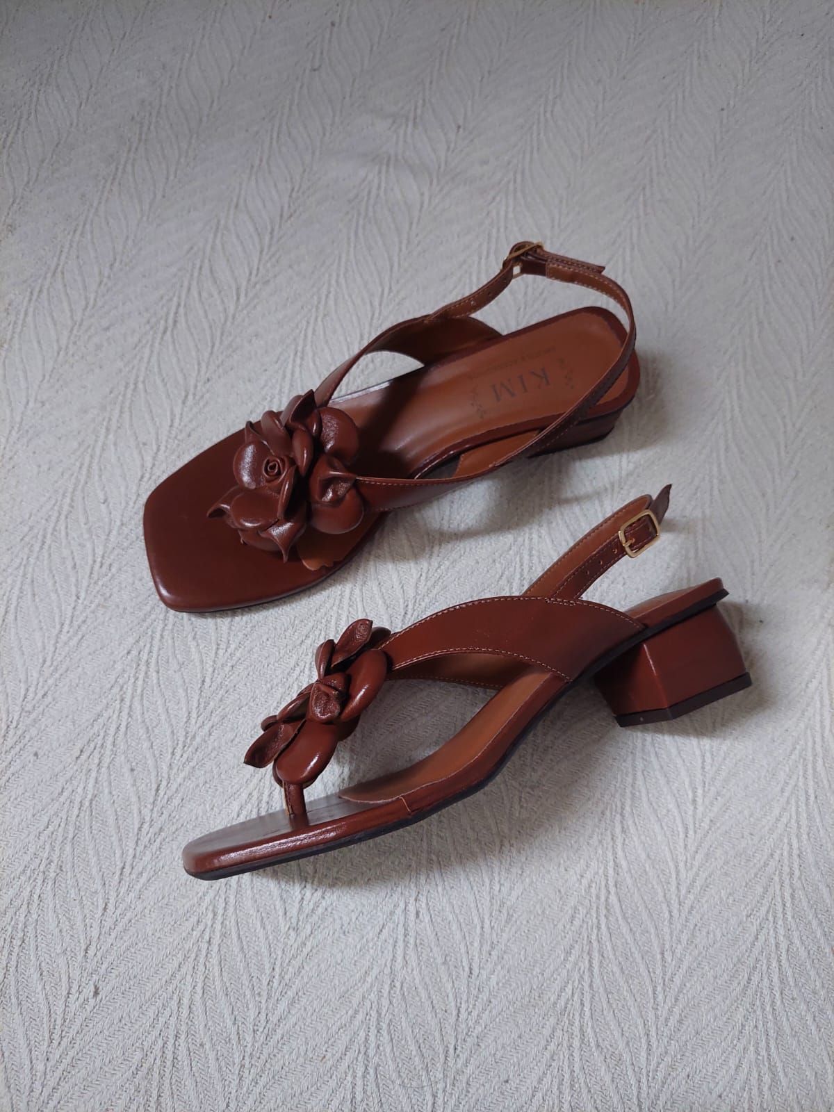 Sandália em couro legitimo e salto de 4,5cm, ela tem as tiras com aplicação em maxi flor no mesmo material de todo o cabedal, tornando uma peça unica alem de delicada,solado emborrachado anti derrapando e palmilha super confortável..