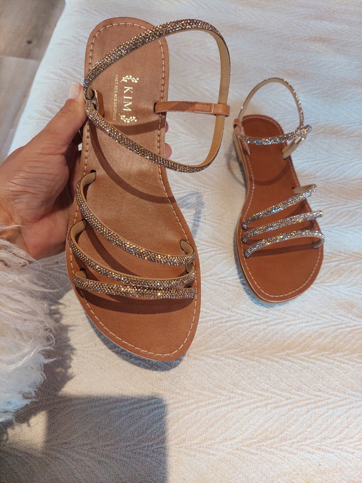 Uma sandalia leve e minimalista, em couro com tiras em strass e um calce facil proporcionando a praticidade do dia a dia,