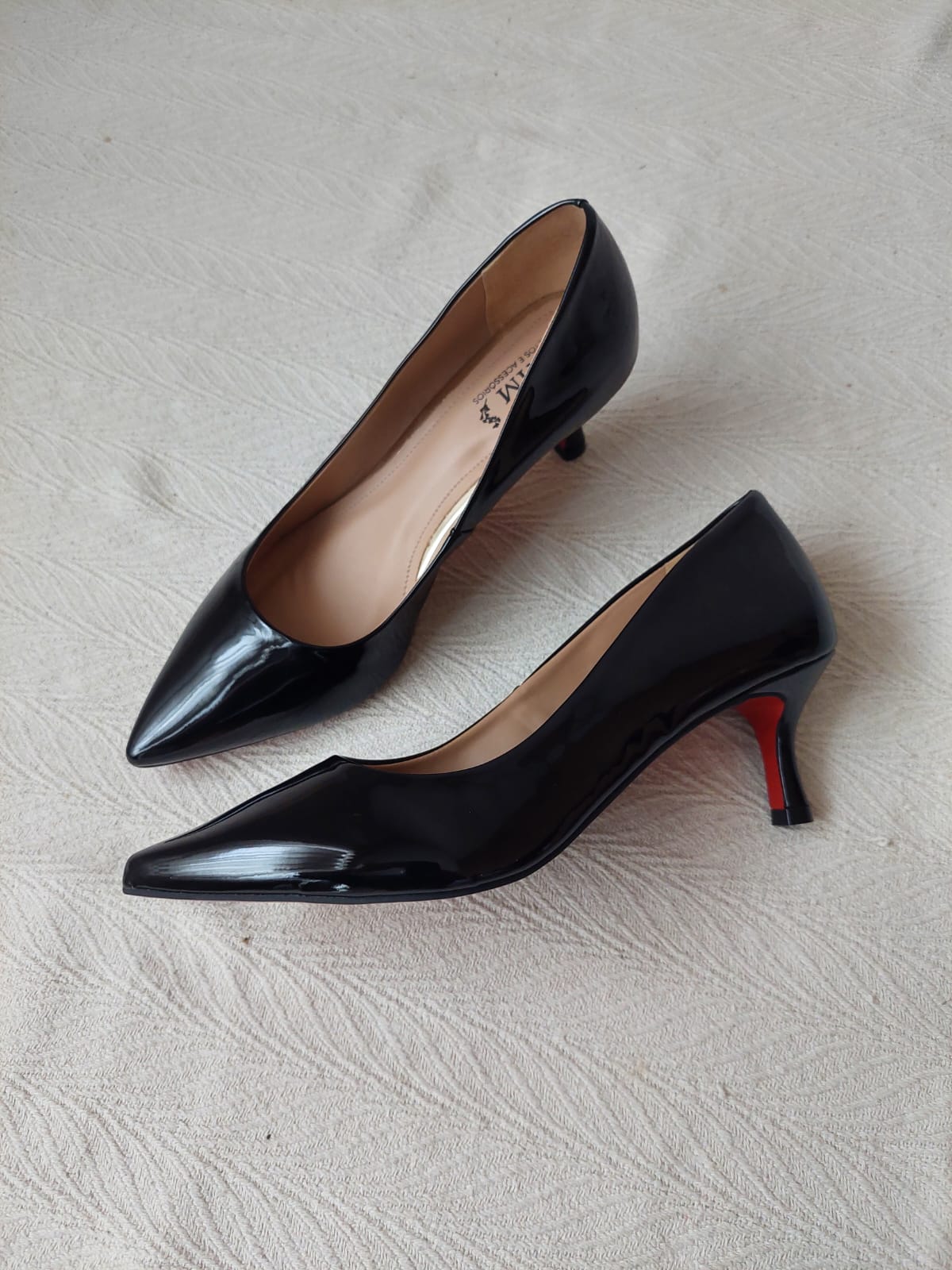 Todo em verniz na cor pretro com salto de 5cm fino e solado microlaqueado vermelho, palmilha confort o classico mais vendido da loja.
