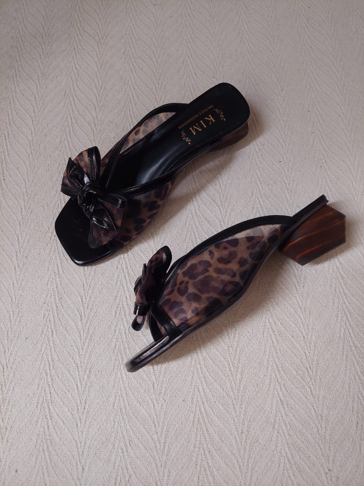 Um Tamanco iconico com a combinação da tela + couro + madeira, ousado e fashionista. salto em madeira de 4,5cm eum laço bem delicado na feito com o mesmo material, solado emborrachado e palmilha super confort.